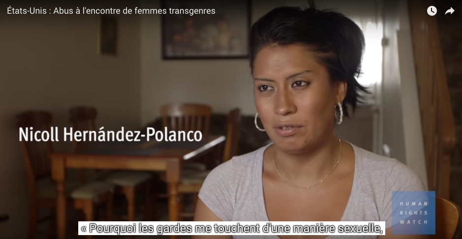Nicoll Hernandès-Polanco, elle, a fui le Guatemala après avoir subi des abus sexuelles et avoir été torturée parce qu’elle est une femme transgenre. À son arrivée aux Etats-Unis, en tant que demandeuse d’asile, elle a été placée six mois dans un centre de détention. « Ils m’ont tant harcelée dans ce centre », raconte-t-elle. « Une fois j’ai protesté et j’ai demandé à l’agent de l’immigration : Pourquoi les gardiens me touchent d’une manière sexuelle et pourquoi les autres détenus me traitent aussi sans respect ? Je suis dans un centre de détention et non dans une prison, je ne purge pas de peine. Je suis venue dans ce pays en quête d’asile parce que je ne voulais plus souffrir mais j’ai fini par revivre tout cela ».