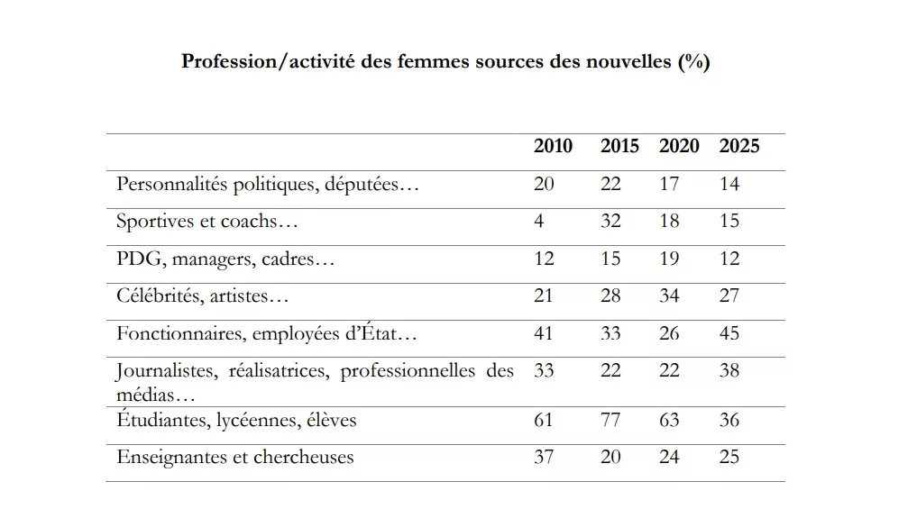 Les chutes sont nombreuses. Les femmes passent sous la barre des 20 % pour la première fois depuis 2010 dans les pages politique : 14% des personnalités politiques en 2025 contre 22, au plus haut en 2015. 15 % des sportives contre 32 en 2015. 12 % des Pdg, managers, cadres contre 19% en 2020. Les femmes sont visibles quand elles ne sont pas en position de décideuses : fonctionnaires, employées (45%), artistes (27%) ou étudiantes, lycéennes (36%).