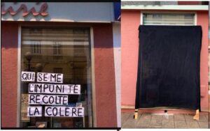 Illico, une camionnette de policiers est venue poser des paravents noirs sur la vitrine. « À 7 h, nous avons collé nos messages, avec l’accord des gérantes. Une heure plus tard, alors que nous venions de terminer, deux policiers en civil puis une dizaine de CRS en uniforme sont arrivés pour décoller ceux qui étaient à l’extérieur », indiquent les membres niçoises du Collectif de collages féministes à Nice Matin.
