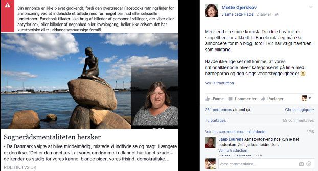 Dans le tabloïd danois Ekstra Bladet, qui a renommé pour l’occasion la sculpture « The dirty Little Mermaid » (La sale Petite Sirène), Mette Gjerskov rit jaune : « Il y a de quoi se taper sur les cuisses devant ce fonctionnement ridicule. Mais les gens qui ne se contentent pas de prendre cela comme une grosse blague devraient aussi interpeller Facebook ». Pour elle, il est désormais temps d’apporter une réponse politique à la politique de Facebook.