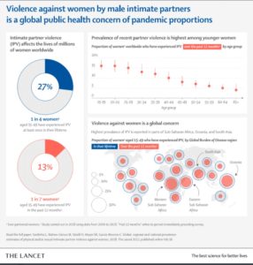 « Dans le monde, 27 % des femmes âgées de 15 à 49 ans ayant déjà vécu en couple ont subi des violences physiques ou sexuelles au cours de leur vie, dont 13 % au cours de l’année précédant l’enquête. Cette violence commence tôt : 24% des femmes âgées de 15 à 19 ans et 26% des femmes âgées de 19 à 24 ans ayant déjà subi cette violence au moins une fois depuis l’âge de 15 ans. » Ces chiffres, publiés le 17 février dans la revue The Lancet ont été obtenus à partir de la compilation de nombreuses études (366) provenant principalement de l’Organisation mondiale de la santé (OMS) entre 2000 et 2018. Les réponses de 2 millions de femmes de 161 pays ont pu être ainsi collectées. Et la situation ne s’est sans doute pas arrangée depuis 2018, avec la pandémie qui a, selon plusieurs études, accru la précarité, la pauvreté des femmes et la violence qu’elles subissent.