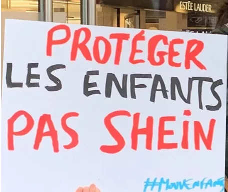 Ce lundi 3 novembre, Mouv’Enfants, a organisé une manifestation devant le BHV, le grand magasin qui se prépare à accueillir la marque Shein dès mercredi. « Protégez les enfants, pas Shein » « Honte au BHV ! Honte à Shein ! », « Dégagez Shein » ont interpelé les manifestant.es. Au sol, l’association avait imité une scène de crime en déposant des objets sur un drap blanc : une poupée, des vêtements d’enfants éparpillés.