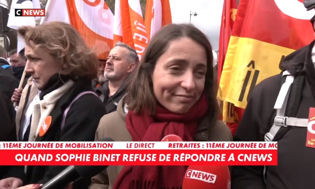 Car la nouvelle dirigeante syndicale ne compte pas laisser les médias lui dicter le tempo. Elle l’a dit avec un très grand calme au micro de Cnews jeudi 6 avril. Pour la 11e journée de mobilisation contre la réforme des retraites, une journaliste lui pose des questions dans le cortège de l’intersyndicale. Sophie Binet commence à répondre puis, voyant qu’il s’agit de la chaîne de Vincent Bolloré, elle dit « Je ne souhaite pas répondre à CNews. » La journaliste de la chaîne demande alors pourquoi. Réponse : « Parce que je ne vais pas sur vos plateaux » et ajoute « Je m’adresse à tous les médias qui garantissent la liberté d’expression et la pluralité ».